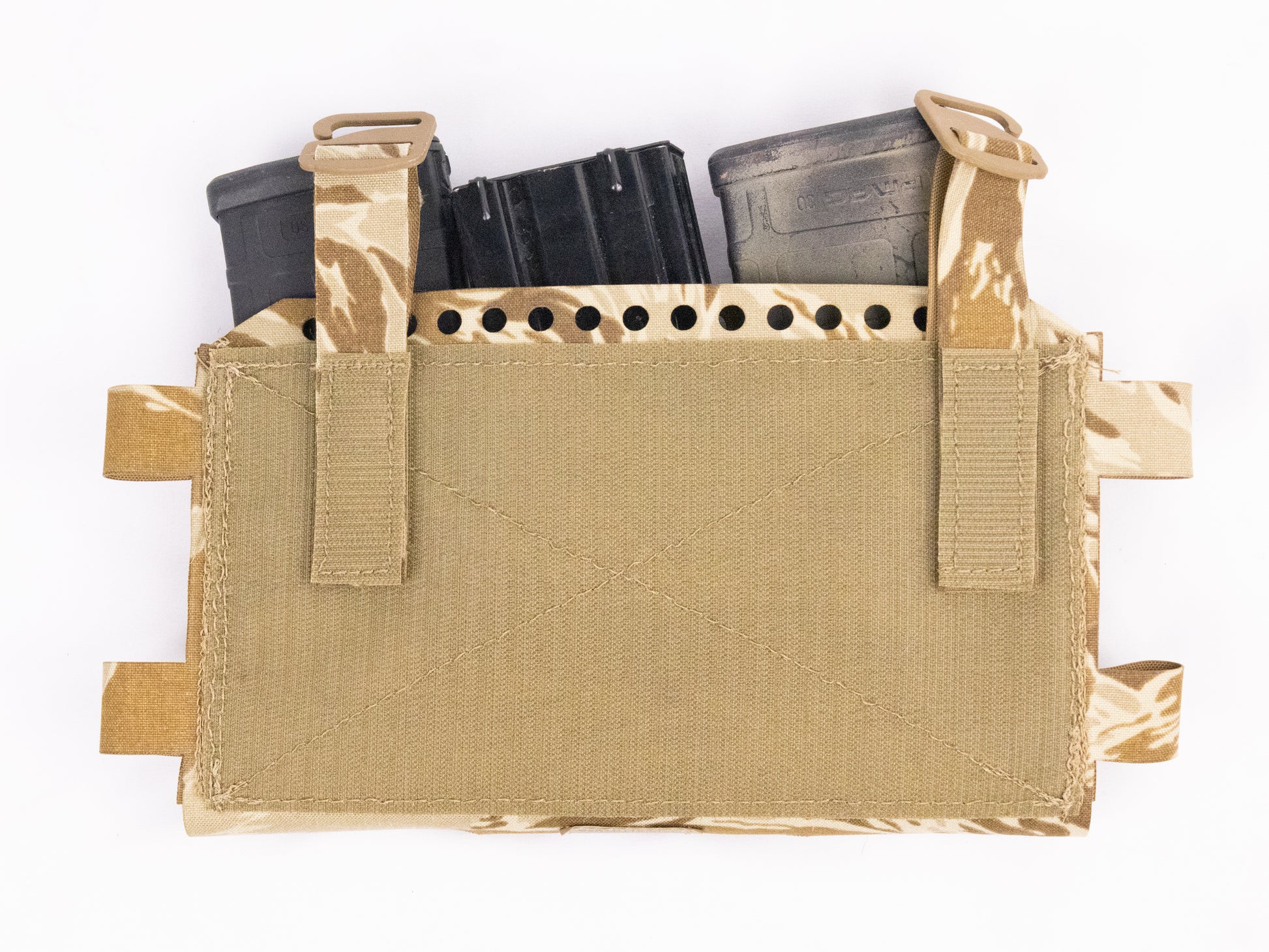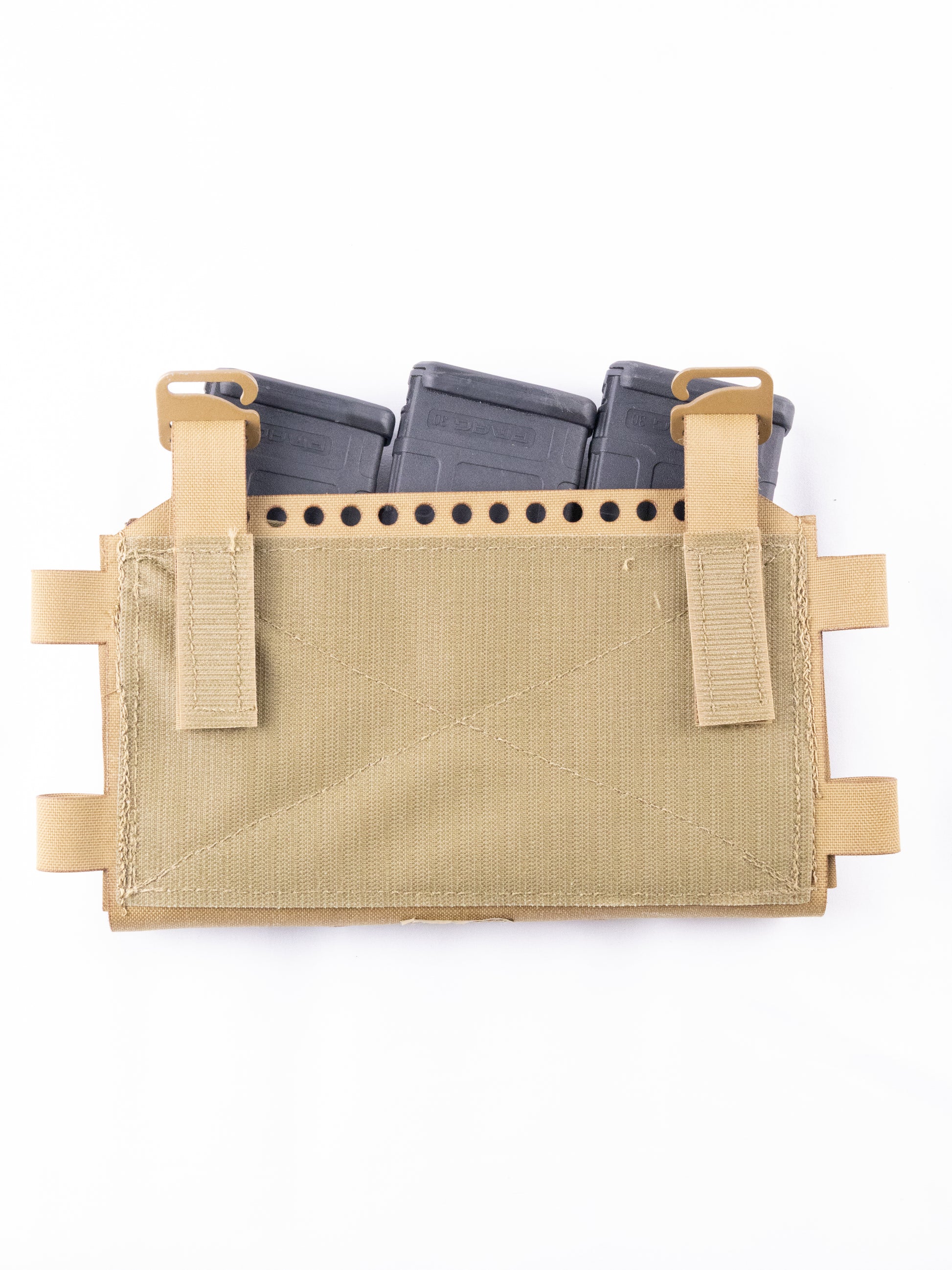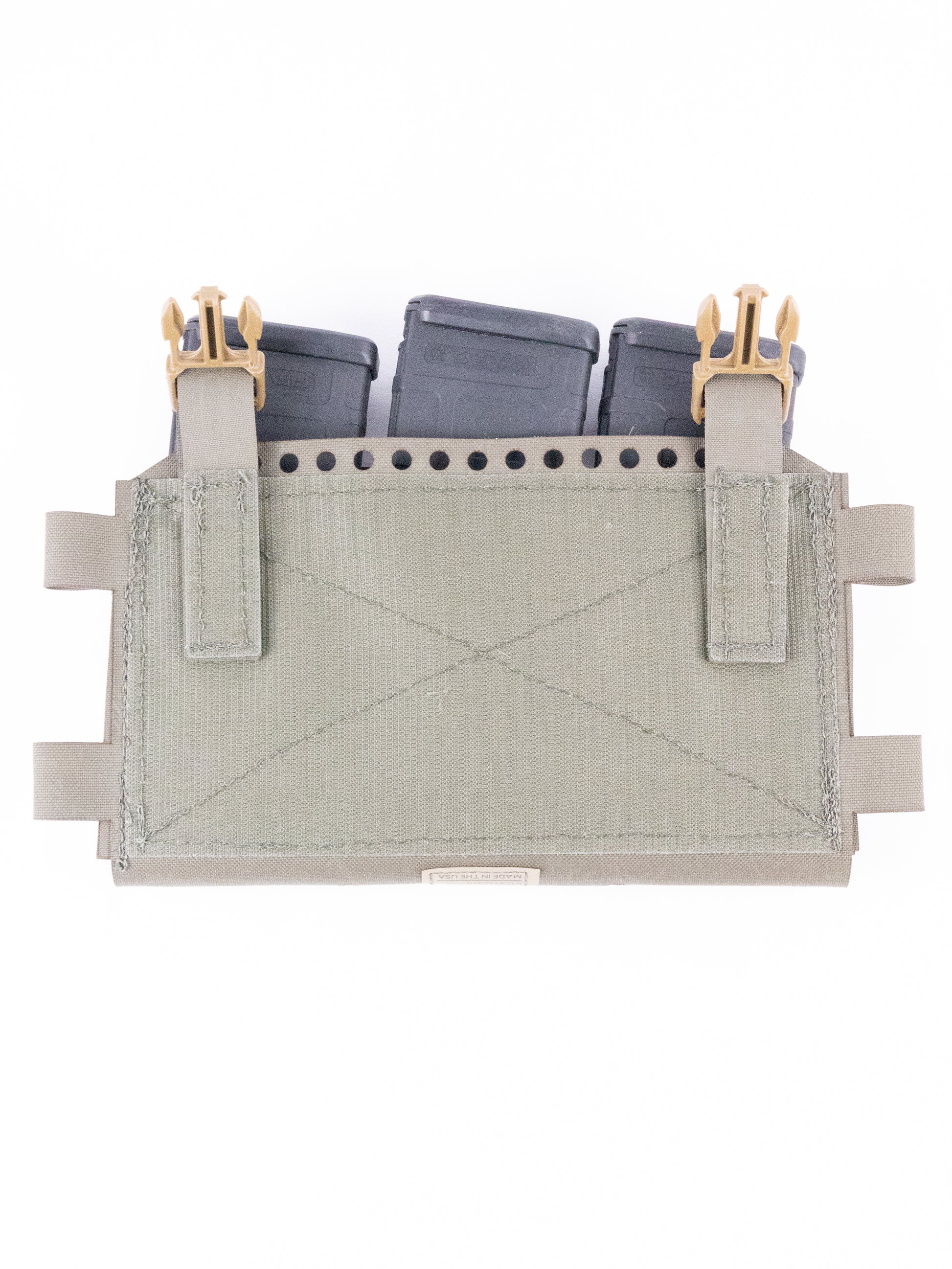 Side loops accept split-bar buckles for chest-rig configuration. Two 1/4-inch drainage holes at the bottom allow water to escape and can be used to route shock cord for securing items beneath the rig.