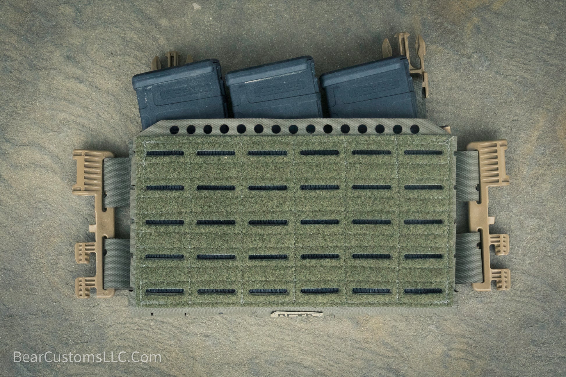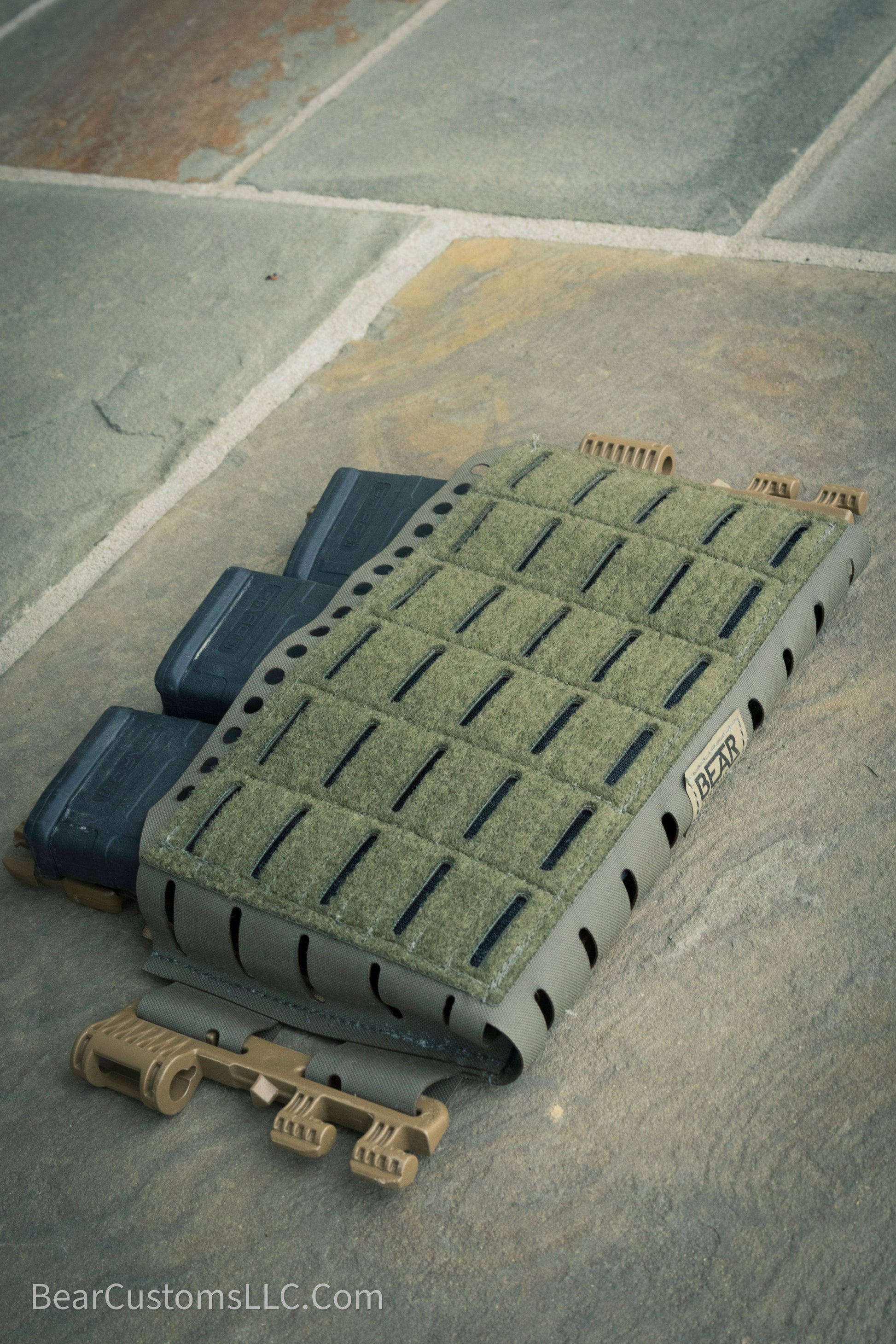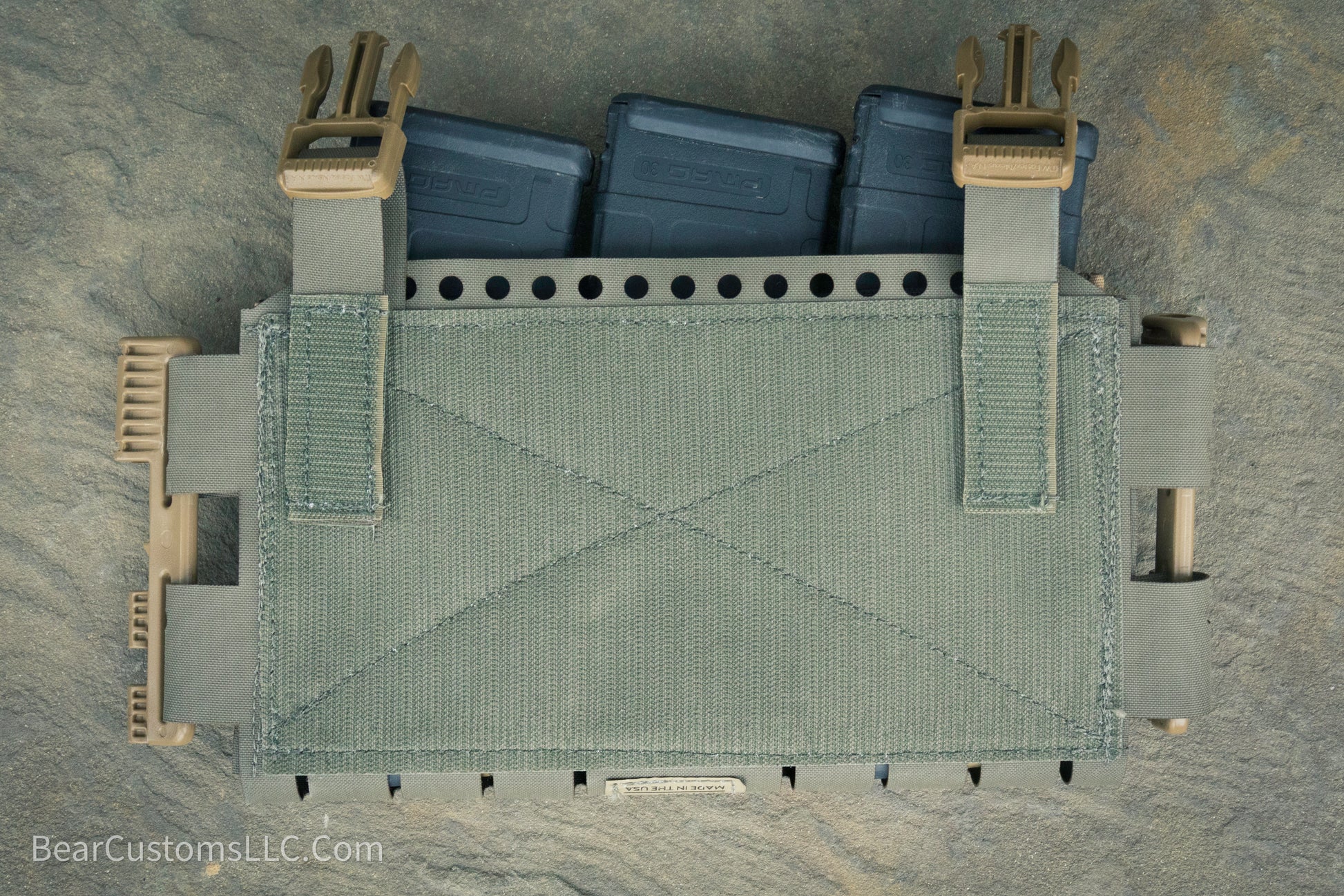 The placard itself can be run standalone as a chest rig or mounted to a plate carrier. This rig can accommodate a variety of calibers due to the easily swappable elastic inserts this rig uses. This chest rig is also compatible with industry standard hook backed inserts if you already own some. Shock cord holes along the top of the placard allow for magazine retention. There's plenty of velcro and molle up front for expansion, as well as single rows of molle on either side for slim pouches. Lastly, danglers and wing pouches can be attached via velcro to the rear of the pouch.